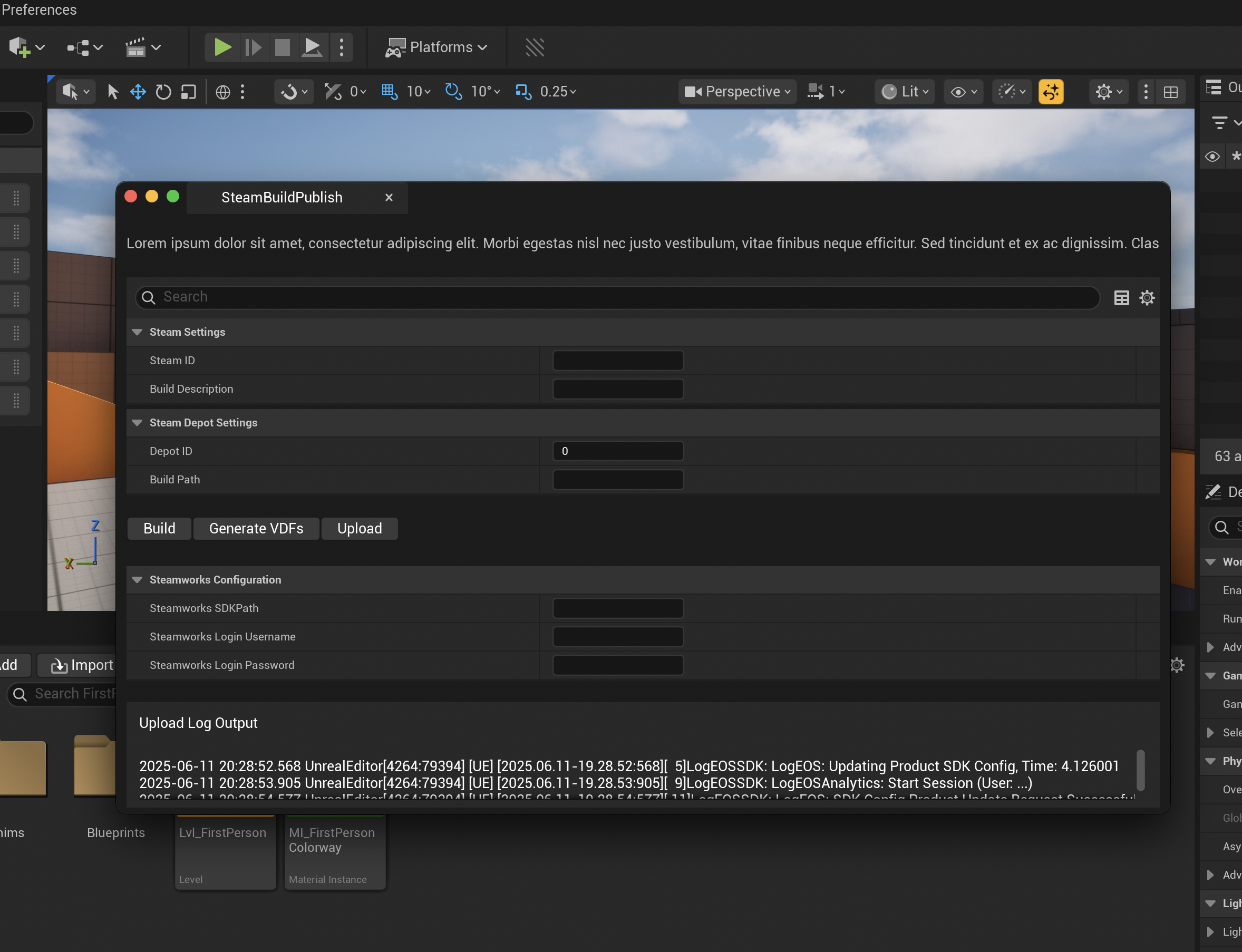 Below is a screenshot of the SteamBuildPublish plugin that I’m working on to automate building and uploading to a steam depot without leaving UE5